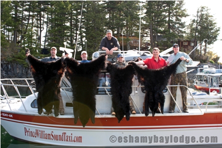 This Memorial Weekend we had a group of hunters reserve Eshamy Bay Lodge for their headquarters for Spring Black Bear hunting in Alaska’s Prince William Sound. These 6 guys took advantage of our location and upgraded from camping to sleeping in Cabin rooms and having nearby bathrooms to take advantage of. They stayed 3 nights/ 4 days and traveled throughout Prince William Sound on their boat and skiff for their unguided black bear hunts. Each day they had meals prepared for them in our Cookhouse and prepared packed lunches to take along. A campfire was lit each night, with a warm room and cozy bed waiting just a short walk away. This group enjoyed their stay in the Alaskan Wilderness with us and some of them even squeezed in some fishing! These guys took camping to the next level and it paid off… 4 out of 6 got their Prince William Sound Black Bear! We hope to see this group again and we’re glad they had such a successful Black Bear Hunt! What a great trip to start off the season!