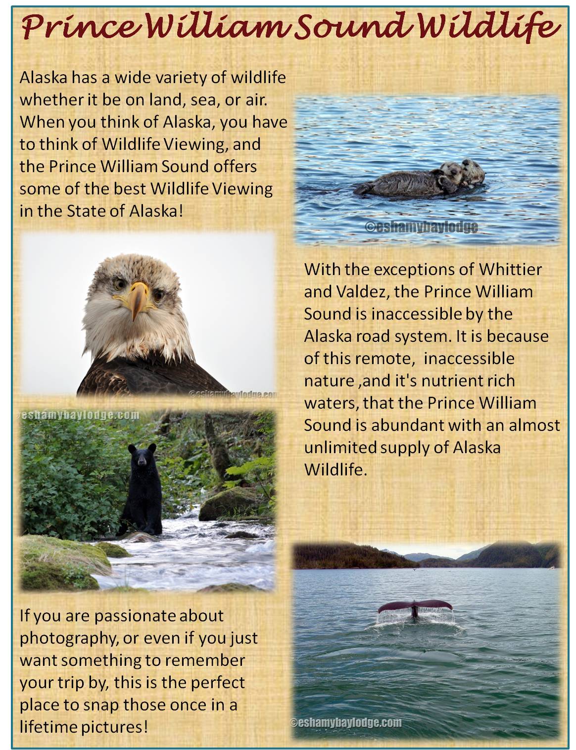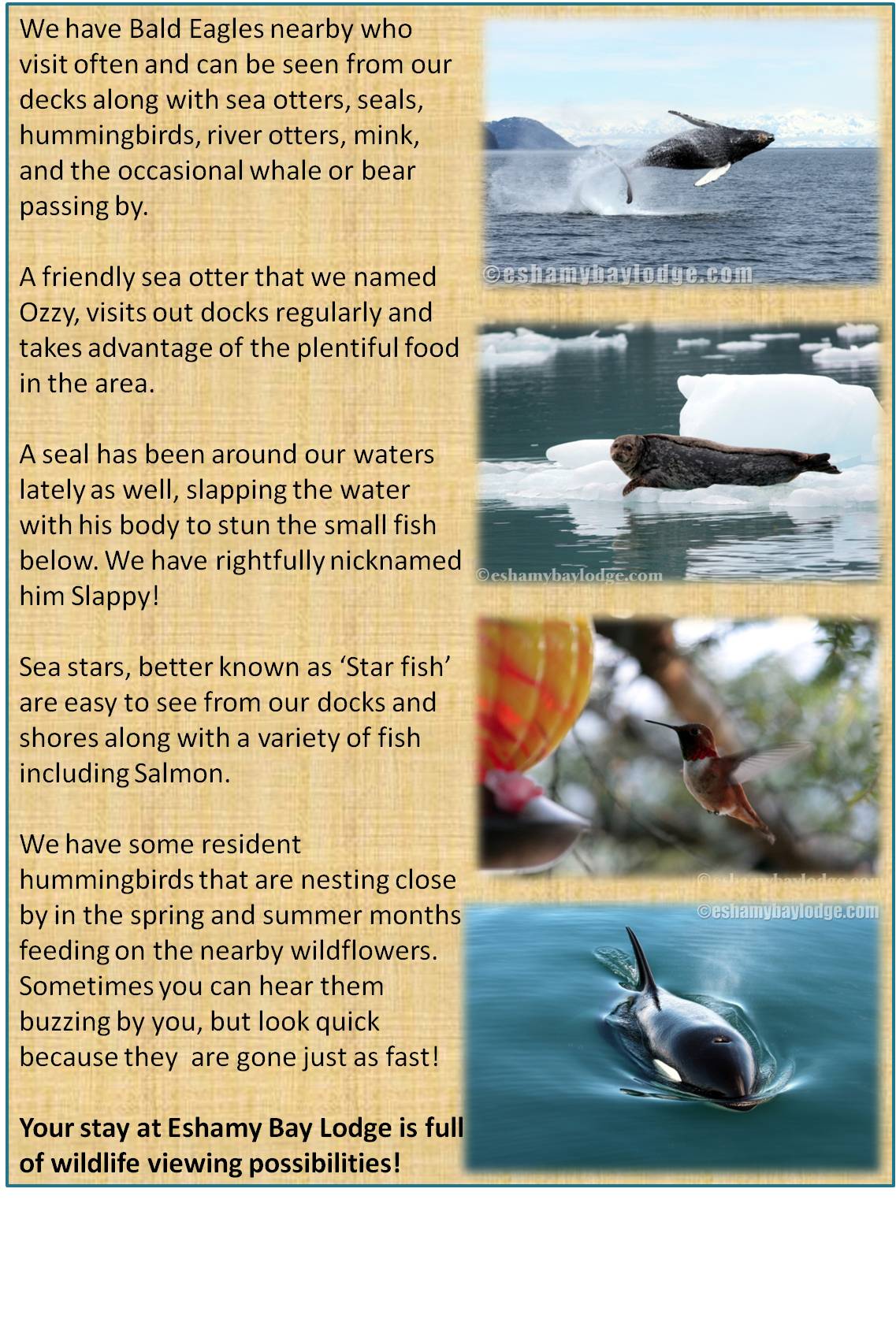 On the trip to and from the lodge as well as at Eshamy Bay Lodge, visitors can expect to see, otters, seals, sea lions, Dahl Porpoise, eagles, as well as a variety of birds.